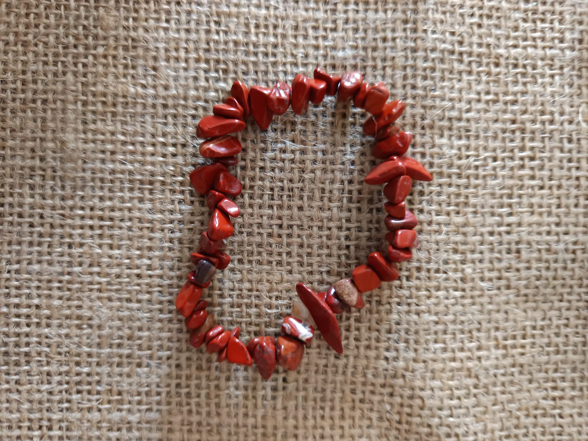 Bracciale con Diaspro Rosso naturale, pietra di stabilità, radicamento e protezione fisica ed energetica. Aiuta a mantenere equilibrio nelle situazioni stressanti, rafforza coraggio, resistenza e senso di sicurezza. È indicato per chi ha bisogno di sostegno emotivo, fermezza e centratura durante sfide o cambiamenti.