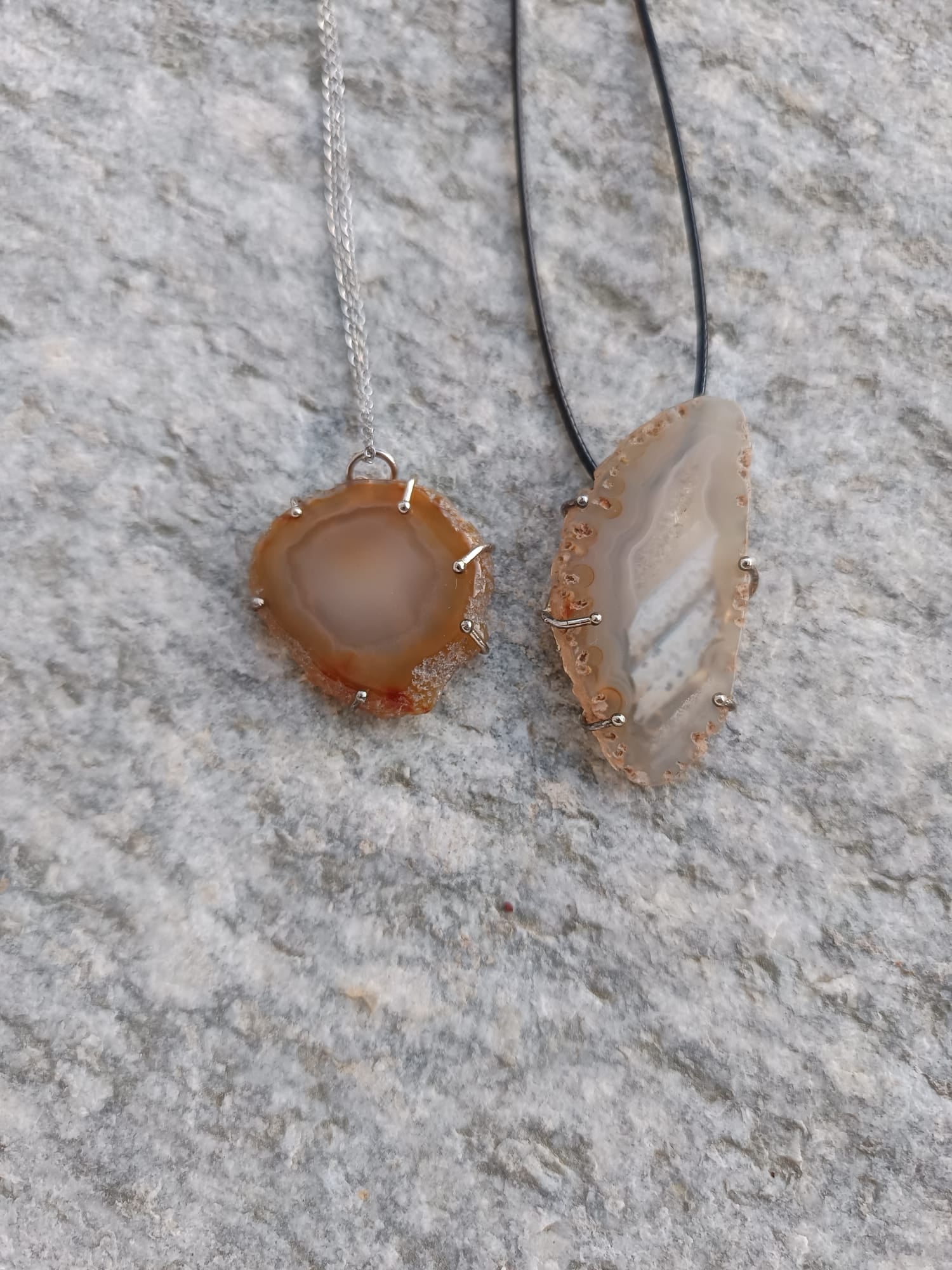 Ciondolo unico realizzato con una geode di Agata naturale tagliata a mano e mantenuta con bordo grezzo per valorizzare le sue meravigliose stratificazioni. Il cuore della pietra mostra una delicata cristallizzazione druzy, simbolo di energia pura e trasformazione interiore.