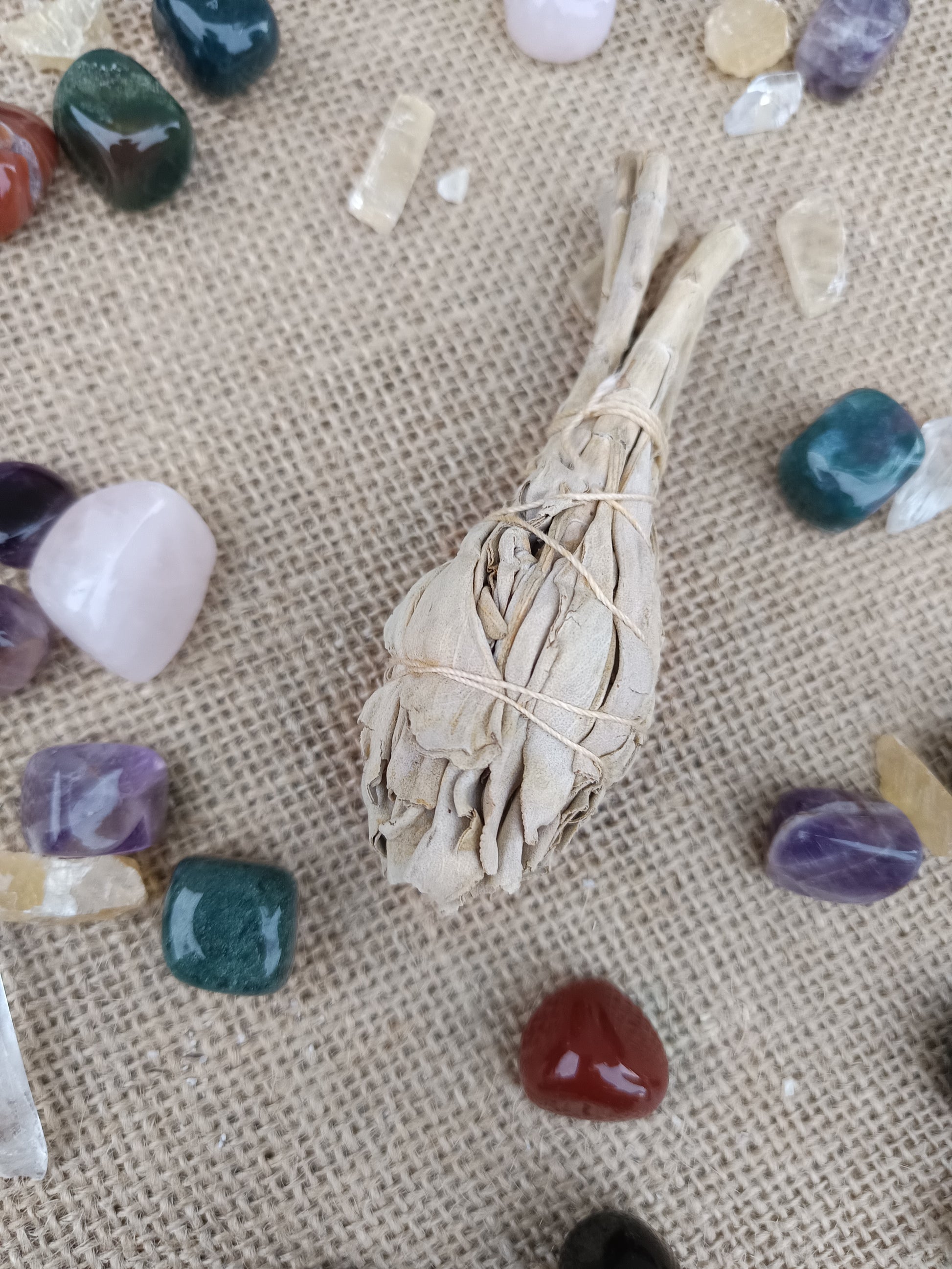 Mazzetto di erbe essiccate per la pulizia energetica degli spazi. Bruciata lentamente, libera un fumo aromatico che purifica e rinfresca l’energia della casa.